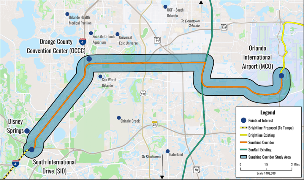 The website provides an interactive Overview Map and describes its characteristics: “The Sunshine Corridor Program includes expanding the existing SunRail commuter rail service to connect to Orlando International Airport (MCO), then west to the Orange County Convention Center (OCCC), then southwest to South International Drive, and potentially the Disney Springs areas. Ultimately, it would provide direct transfers to the privately operated Brightline intercity passenger rail system connecting Miami and Orlando, with a proposed connection to Tampa in the future.” According to FDOT, the corridor on the agency’s map is shown as wider than a rail line is customarily depicted, because the final alignment has not yet been confirmed.