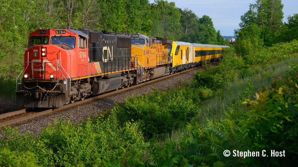 Handed off to CN in Chicago by UP, the train operated as expedited freight and completed the journey in about five days. This delivery marks the halfway point of the 32-trainset, C$989 million order announced in December 2018. UP 6446 and CN 5764 teamed up for motive power, ensuring this special movement did every mile per hour of track speed on the journey in Canada.