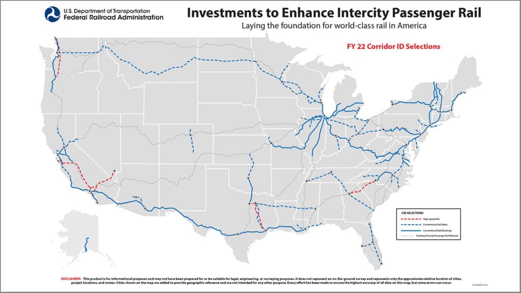 According to the FRA, “The Corridor Identification and Development (Corridor ID) Program is a comprehensive intercity passenger rail planning and development program that will help guide intercity passenger rail development throughout the country and create a pipeline of intercity passenger rail projects ready for implementation.” The agency says: “For each selected Corridor, FRA initially awards the grantee $500,000 for eligible activities related to the initiation of a grantee’s Corridor development efforts to include the development of a scope, schedule, and cost estimate for preparing a service development plan (SDP) for a Corridor.” These initial grants are only the beginning, and 69 projects around the country have received them. Funding came from the Infrastructure Innovation & Jobs Act (IIJA), also known as the Bipartisan Infrastructure Law (BIL).”