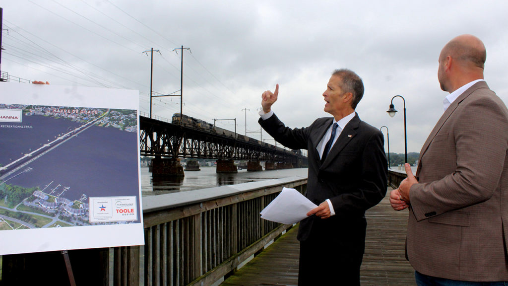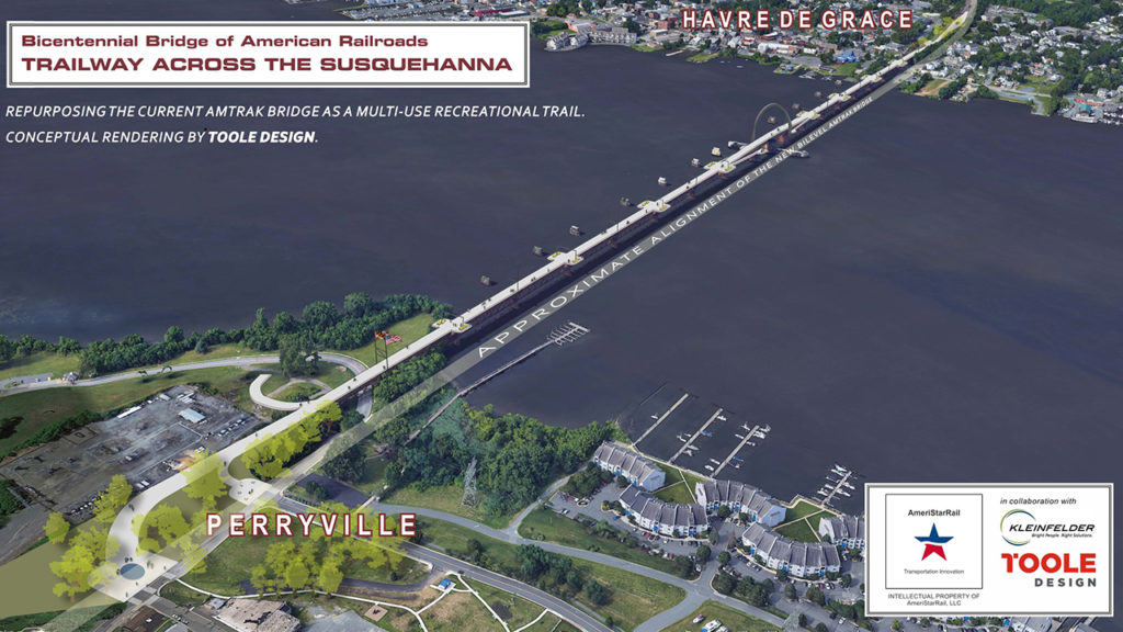 Spencer unveiled the AmeriStarRail plan at an event in Perryville, near the existing elevated railroad structure, on Sept. 26. He is a long-time railroader and currently Chief Operating Officer at AmeriStarRail. Project details, including the full proposal, can be found on the company’s website. According to the site: “Unlike Amtrak’s plan to replace its current bridge, built in 1906, with twin bridges by the Year 2036, AmeriStarRail, in collaboration with Kleinfelder and Toole Design, propose that Amtrak and Maryland DOT finance and build just one bi-level bridge to be completed by 2030 without demolishing the current bridge. This would allow the existing Amtrak bridge to be converted into the Trailway Across the Susquehanna.” The Kleinfelder firm works in the field of railroad design, while Toole Design works in the field of city and town planning.