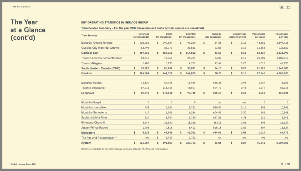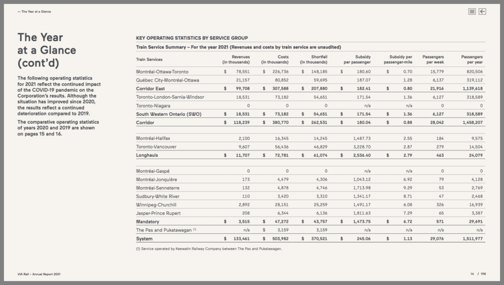 • VIA Rail said it “achieved its goal of staying on budget within the funding allocated to the corporation by the government of Canada, benefiting from an increase of 31.9% in ridership and of 54.3% in passenger revenues compared to 2020.”