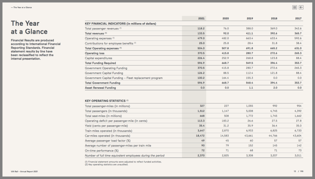 “Like many companies in the transportation industry, VIA Rail continued to face the impacts of the various waves of the pandemic,” Chief Financial Officer Marie-Claude Cardin noted in the 2021 Annual Report. “Nonetheless, as we have always done over the past two years, we found ways to strike a balance between our important public service mandate while proactively managing the financial impacts on our operations.”