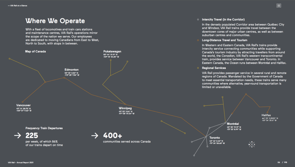 • In 2020, VIA Rail “reviewed its policies, practices and sustainability priorities to inform the development of a five-year sustainability plan, which progressed steadily in 2021, and which will embed environmental, social and governance performance in all VIA Rail’s operations.”