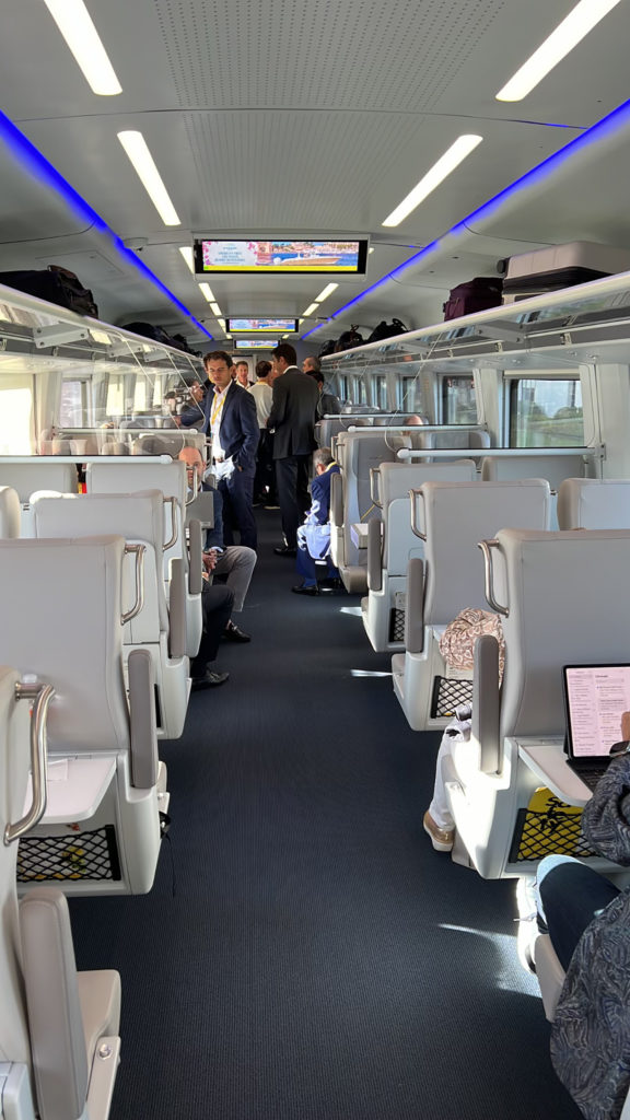 Railway Age Publisher Jonathan Chalon was aboard the first train. “Brightline is the perfect solution for a less-than-300-mile trip,” he reported. “It will take a longer time to drive or fly with all the typical procedures or delays. The main terminal in Miami makes an exceptional impression of train service. The station is clean and modern, and offers many locations for food and drink. Pre-screening security is easy and an important feature for the service. The trains are modern, clean and comfortable. Food service and drinks were very good. The fastest part of the route is when the train curves west from Cocoa Beach to the Orlando airport. Peak speed was 125 mph, when we blew past the cars on the highway. The arrival station in Orlando is just as nice as MiamiCentral. There is a seamless connection to the main terminal area via the airport train. I was easily able to make my 12:09 p.m. flight with a train that got into Orlando at 11:05 a.m.”