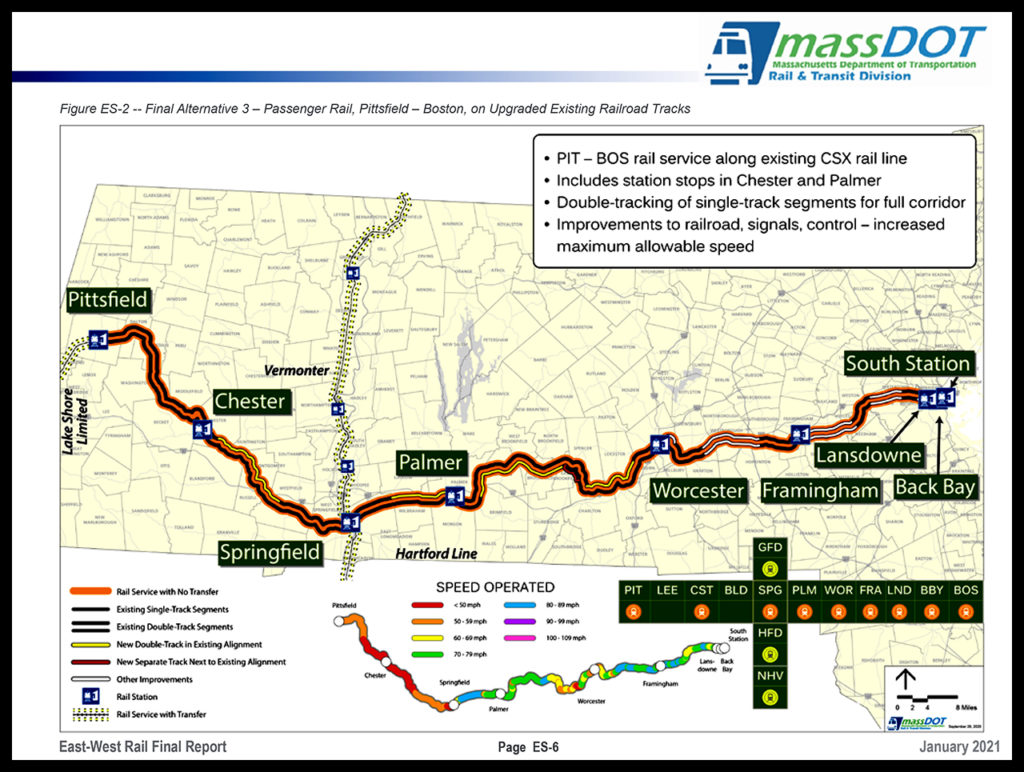 The most recent report, the “Final Report” from a MassDOT study released in January 2021 (download below), called for three alternatives, which would add between seven and nine new daily round trips, and additional stops at Palmer (east of Springfield) and Chester (between Springfield and Pittsfield). An earlier report. the 2016 Northern New England Intercity Rail Initiative (NNEIRI) Study included six alternatives, two running only as far as Springfield, either through-running from Boston or as a shuttle from Worcester. According to Trains in the Valley, “In 2016 MassDOT chose not to move forward with any of the recommendations from the NNEIRI study for reasons that were never fully explained.”