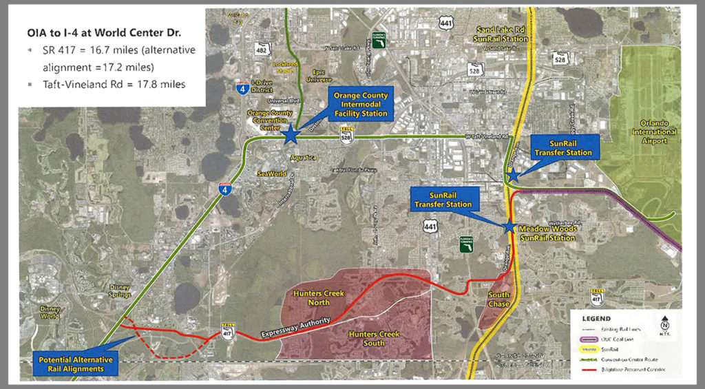 At the time, Right Rail promoted the alternate route this way on its website: “This route would follow SR 528 through mostly industrial areas, while connecting Orlando International Airport to the Orange County Convention Center and the I-Drive tourism corridor and supporting 75,000 jobs in the area. It would also help spur the much-needed connection and expansion of local public transit systems such as SunRail.” The push was bolstered by a decision from CFX to back away from the Route 417 alignment, as reported by Kevin Spear in the Orlando Sentinel on July 20, 2021: “The Central Florida Expressway Authority agreed unanimously Tuesday to delay indefinitely a decision over whether to allow Brightline Trains to build passenger rail beside the agency’s State Road 417 on the way from Orlando’s airport to Walt Disney World and Tampa.” Spear’s report continued: “The vote came after nearly 3.5 hours of discussion dominated by a coordinated push from representatives of the International Drive tourism strip and the Hunter’s Creek residential community to deny access by the private rail company to the tolled S.R. 417 expressway. Such a denial would force Brightline to consider a significantly more costly route to the tourism strip.” Spear also reported that Brightline estimated the cost of the Route 417 alignment at $1 billion, while the building on the competing alignment could cost up to $700 million more, and a price tag as high as $2.2 billion was possible.