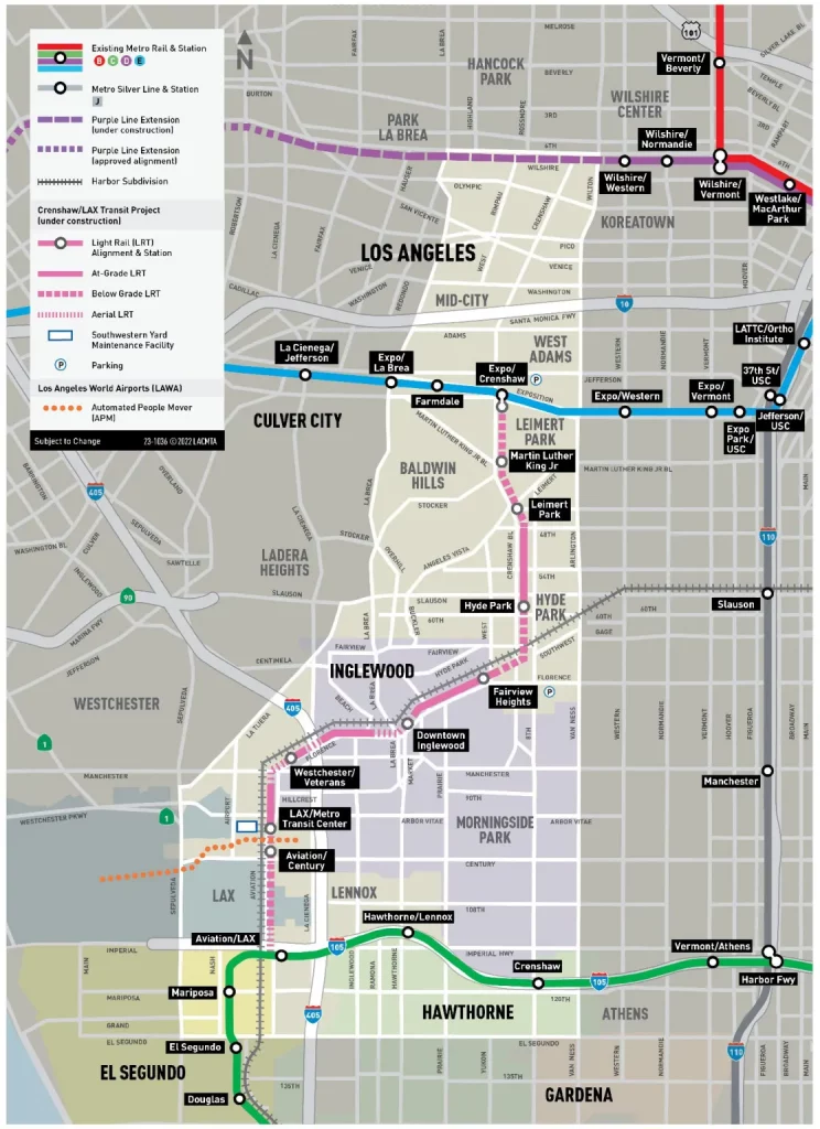 The K Line extends from E Line (Expo) at Expo/Crenshaw Station and eventually merges with C Line (Green) at Aviation/LAX Station, connecting the Crenshaw Corridor, Inglewood and El Segundo. It brings a “new era of equitable transportation investment that connects the Crenshaw Corridor and Inglewood residents to convenient, fast, reliable and low-cost rail transit that has not served the area since the Los Angeles Railway’s Yellow Cars shut down service in the 1950s,” Metro says.