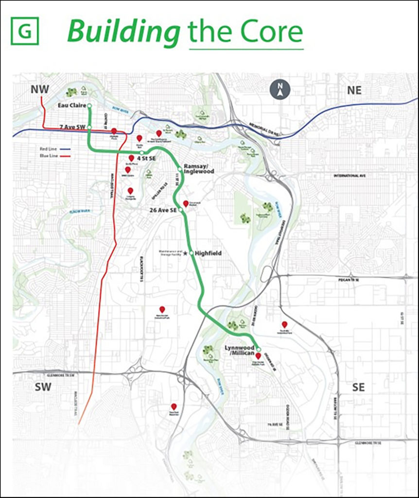 Green Line Phase 1 construction will start with building the core from Lynnwood/Millican in the southeast to Eau Claire downtown, connecting the existing Red and Blue LRT lines. Construction of the remainder of Phase 1 south to Shepard, as well as any future extensions north or south, will proceed when additional funding is in place. “This decision will allow for new Bus Rapid Transit (BRT) and bus service in the southeast to provide connections into the LRT, contributing to the projected opening day ridership of approximately 32,000 Calgarians,” the agency said.