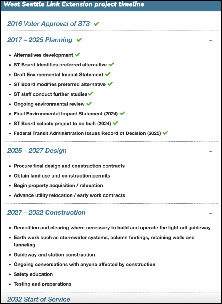 The Federal Transit Administration in April 2025 issued a Record of Decision approving the West Seattle Link Extension project and allowing it to advance to the design phase. That approval was the culmination of the planning phase that began in 2017, according to Sound Transit.