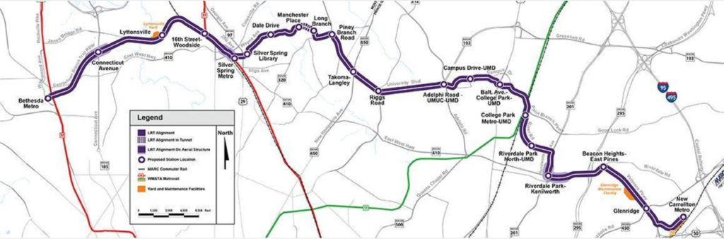 The organizations on March 1 reported requesting Maryland Board of Public Works’ approval of a modification to their Purple Line Public-Private Partnership (P3) agreement that extends the contractual deadline for achieving revenue service availability to winter 2027. The 16.2-mile, 21-station light rail project, which broke ground in 2017, is slated to carry riders between Bethesda in Montgomery County and New Carrollton in Prince George’s County, and to provide direct connections to four branches of the Washington Metropolitan Area Transit Authority system, all three MARC commuter rail lines in the Baltimore-Washington metro area, and Amtrak’s Northeast Corridor line; the project also includes completion of the Capital Crescent Trail. Originally anticipated to open in March 2022, the Purple Line was plagued with delays and cost overruns that led to litigation, which was resolved in November 2020.