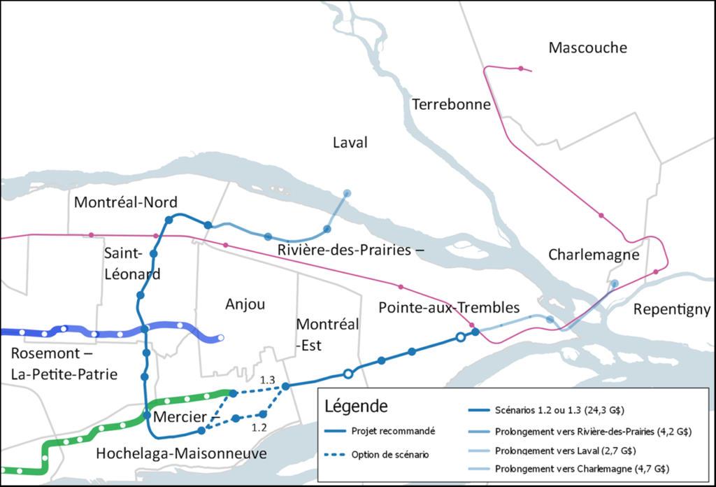 An ARTM map shows where the proposed line would run. The northern terminus would be at Cégep Marie-Victorin in Montreal North, a few blocks from the Anjou station on Exo’s Mascouche Line, which runs limited weekday service, primarily at peak commuting hours. From there, the line would proceed in short southerly and westerly segments to Lacordaire Boulevard (3 stops). It would then proceed south on Lacordaire and Dickson St. (9 stops) on the northern branch. It would then turn left onto Sherbrooke St. East (10 stops) to Pointe-aux-Trembles, near another station located further east on the Mascouche Line. The innermost four stops of the eastern branch will run above the Metro Green Line and provide connections with the four easternmost stations on that line: Cadillac, Langelier, Radisson and Honoré Beaugrand. The Lacordaire station, in the middle of the northern branch, is slated to connect with a future extension of the Metro Blue Line eastward from its current terminal to Anjou. The five new stations planned for the line are expected to open for service in 2030. Cadillac Station is expected to be a major transfer point between the PSE line and Metro’s Green Line.