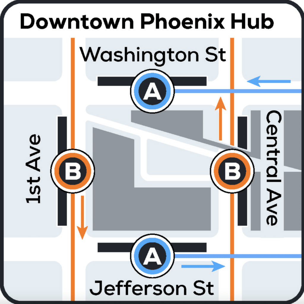 More than 5,000 community members, along with federal, state, and local officials, gathered to celebrate the completed project that connects the existing light rail system in downtown Phoenix and operates 5.5 miles south to Baseline Road (see map, right; scroll down for full map). The project also includes eight stations with a hub in downtown Phoenix (see map below). The A Line now travels east/west between Gilbert Road/Main Street in Mesa and the Downtown Hub; the B Line travels north/south between Metro Parkway in northwest Phoenix and the new end-of-line station at Baseline Road/Central Avenue. The Downtown Hub comprises four platforms on Washington, Jefferson, Central, and 1st avenues where riders will transfer between the A and B lines.