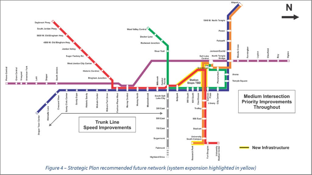 UTA’s TRAX Modernization program to upgrade and expand service over the next decade includes a fourth extemsion of the Orange Line, and all-accessible vehicle boarding. The Authority’s Future of Light Rail study was launched in early 2020 and concluded in January 2023 with the completion of the UTA Light Rail Strategic Plan (download below), prepared by Hatch. The study, which included a comprehensive analysis of the region’s light rail and streetcar network, was conducted “to guide regional transportation improvements that included light rail and streetcar in both the short and long term,” UTA notes. “Service expansion scenarios were generally limited to projects shown as funded in the Metropolitan Planning Organizations’ (WFRC and MAG) 2019 Regional Transportation Plans that did not have a current study under way.”