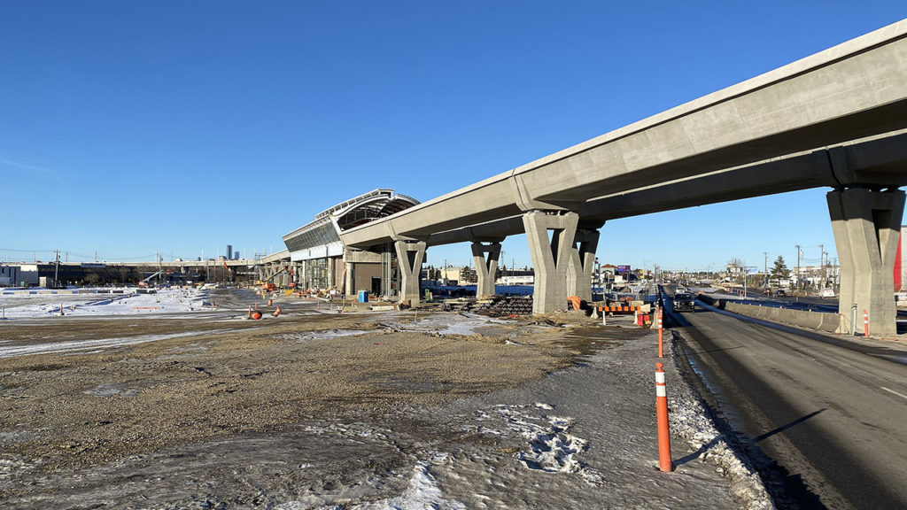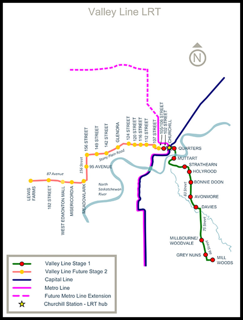 Work began on the LRT project, Edmonton’s first using low-floor vehicle technology, on April 22, 2016. It links downtown Edmonton with the suburb of Mill Woods, 8.1 miles to the southeast. Service is to be provided by 26 Alstom Flexity LRVs, incorporating seven sections, and which are about 150 feet long. There will be 12 stations on the line, whose original budgeted cost was C$1.8 billion.
