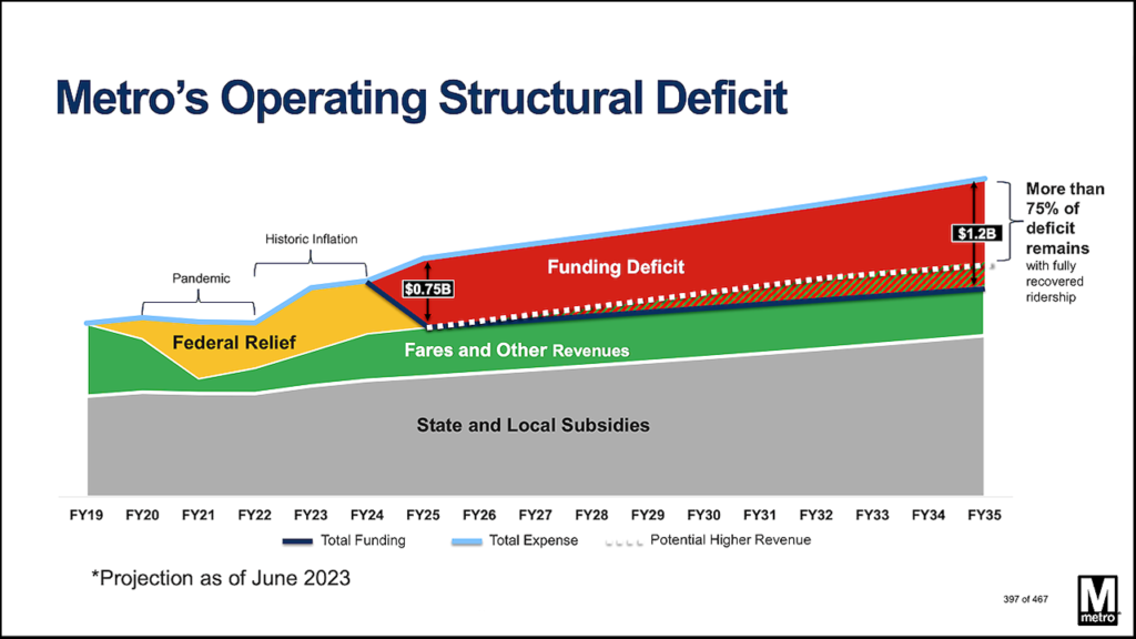 Elsewhere, the day of reckoning will probably come sometime in 2025. WMATA is facing a $750 million deficit (above). NJ Transit, which has never had a legislatively mandated source of stable and secure funding, is facing a shortfall of nearly $1 billion in less than two years. There isn’t room in this article to report on every transit agency’s financial woes in detail, but even the agencies that are planning expansions or other capital projects know (or should know) that capital grants do not pay for operations, even though some agencies are using a portion of their capital funds for the purpose, believing that they have no choice.