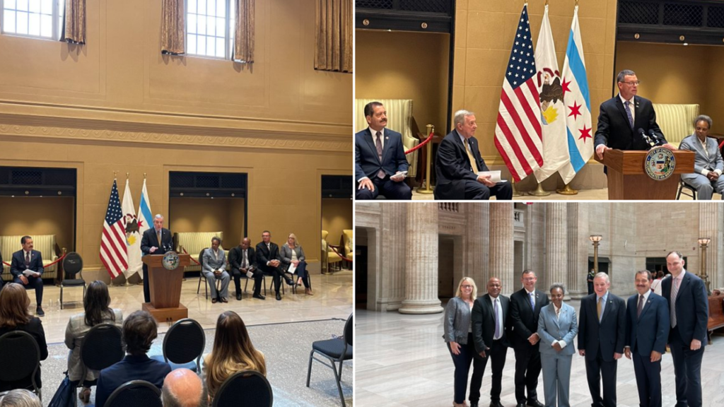 U.S. Senate Majority Whip Dick Durbin (D-Ill.); Chicago Mayor Lori E. Lightfoot; U.S. Rep. Jesús “Chuy” García (D-Ill.-4); Amtrak CEO Stephen Gardner; Illinois Department of Transportation (IDOT) Secretary Omer Osman; Metra CEO/Executive Director Jim Derwinski; Cook County (Ill.) Department of Transportation Superintendent Sis Killen; and other government, labor, business and environmental officials gathered at the station July 7 to announce their alliance. The aim: “to get this essential project across the finish line,” Sen. Durbin said.