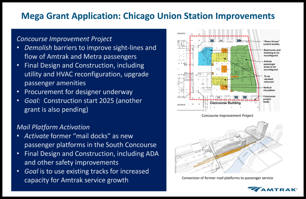 “The Michigan DOT supports Amtrak and our partners in applying for the federal MEGA grant application,” said Michigan State Transportation Director Paul C. Ajegba. “Improvements to Chicago Union Station and the final design of double tracking on the Amtrak-owned line from Niles through and beyond Dowagiac, Mich., will be a huge benefit for rail travelers.”
