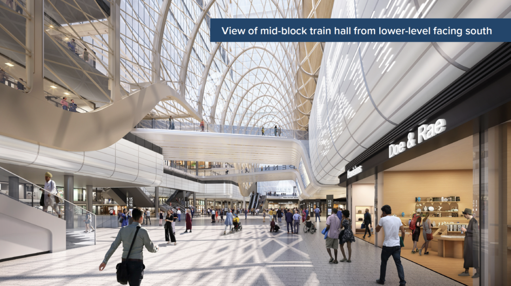 The preliminary design consultant includes WSP|FXC JV, along with noted architect John McAslan, who is recognized for his successful experience designing stations in Sydney, Belfast and New Delhi, and for his design of the reconstruction of Kings Cross Station in London, particularly the skylight in the historic station’s expansion, which created a new train entry hall with an innovative single-span atrium structure that brings in new light and air and creates a central gathering place for commuters.