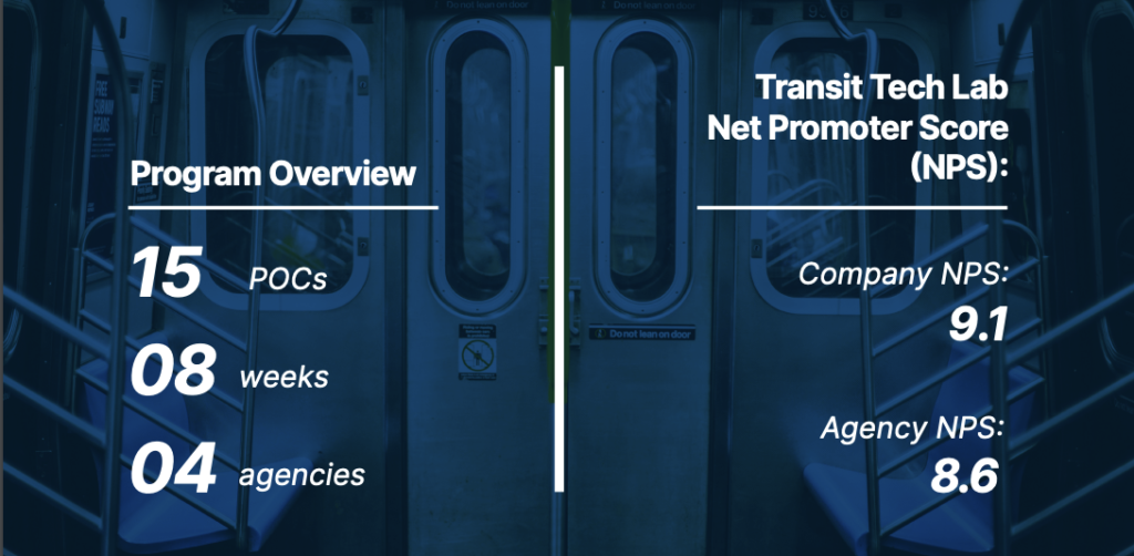 “It was great having the Transit Tech Lab team responsible for locking in and facilitating weekly updates, with plans of action for all parties—this let the companies focus more on their POCs than planning,” stated an MTA Project Manager.