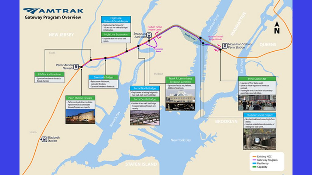 Rising 50 feet above the Hackensack River in the New Jersey Meadowlands along the “High Line” segment of the NEC—double the clearance of the existing bridge—Portal North will span 2.44 miles and includes construction of retaining walls, deep foundations, concrete piers, structural steel bridge spans, rail systems, demolition of the existing bridge, and related incidental works. The U.S. Department of Transportation, New Jersey, New York and Amtrak are funding the project. In January 2021, a Full Funding Grant Agreement (FFGA) that secured $766.5 million in Federal Transit Administration dollars was signed. In October 2021, NJ Transit, as lead agency, awarded a $1.6 billion construction contract awarded to STJV—the single largest construction award in NJT history.