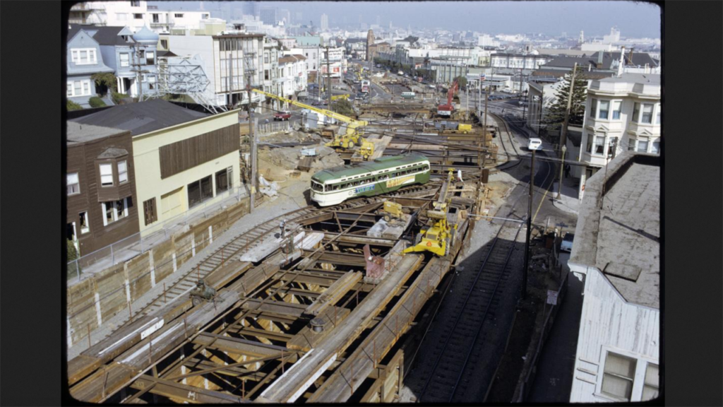 Construction along Market Street was extremely disruptive for the city’s busiest corridor. During construction, Muni streetcars and buses had to navigate constantly shifting reroutes, wooden plank roadways, and sinkholes on top of all the usual street hazards. One of the most dramatic engineering feats was a temporary bridge built over a huge open pit at Collingwood Street. Here, streetcars traveling towards West Portal crossed over top construction on Castro Station to enter the Twin Peaks Tunnel. The temporary ramps built to access the tunnel still exist today and are used for emergency and maintenance needs.