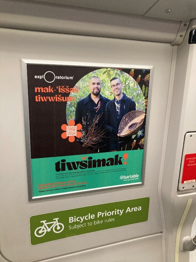 “With our recent work with the ¡Plantásticas! exhibition at the Exploratorium in yelamu—San Francisco—we co-created a space at the museum that uplifts specific cultural knowledge on native plants as taught to us by our elders—powerful teachings that stretch back into the ancient,” Medina and Trevino said in a statement to BART. “This is quite literally the first time label copy at a public museum has been fully translated into Chochenyo, and the first time a BART advertisement has been completely in our language, too; this is something historic on its own right.”