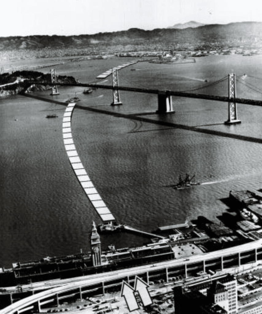 Fast forward to 1947, and Emperor Norton’s grand designs were finally being put into play. That was the year a joint Army-Navy Commission issued their recommendation for an underwater Tube to relieve traffic congestion on the ten-year-old Bay Bridge. Even then traffic was terrible, despite the relief provided by Key System streetcars that ran on the lower deck of the bridge until 1958.