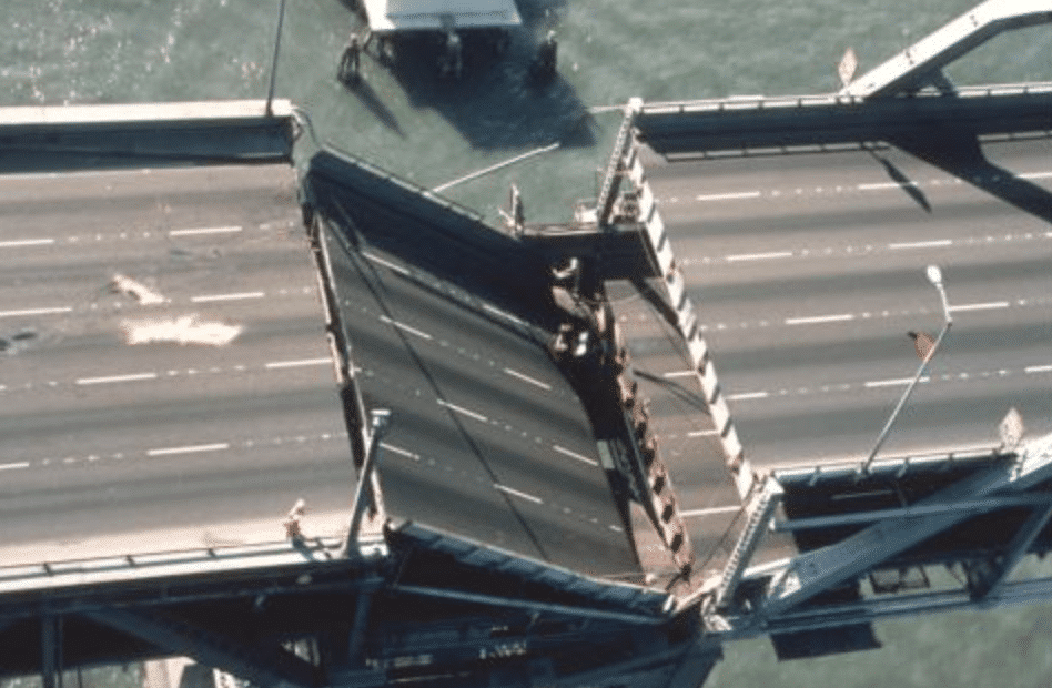 Then there was the San Francisco-Oakland Bay Bridge. A 76-foot-by-50-foot section of the upper deck fell onto the lower deck, causing severe damage and one fatality. The bridge is pictured after the earthquake (right).