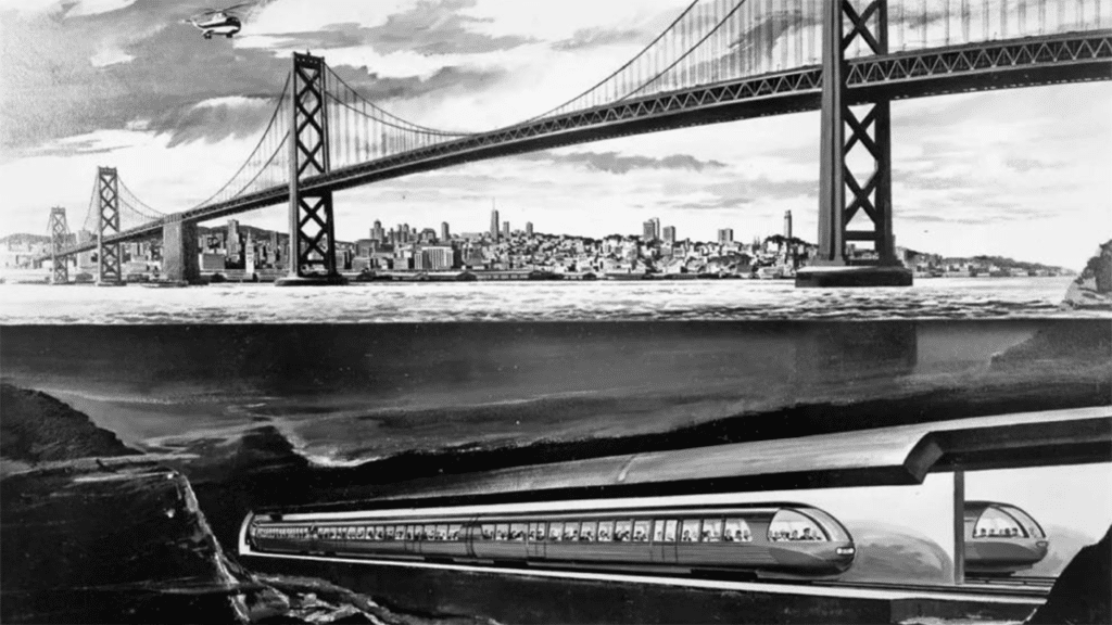 After multiple seismic studies, a soil investigation program, and even the installation of an earthquake recording system on the floor of the Bay, a preliminary route was selected that would avoid as much bay bedrock as possible. Actually, the route wasn’t that far off from the one Emperor Norton initially proposed. The cost of the project was estimated at $132,720,000 (or about $1.4 billion in 2023 dollars) and was to be financed by toll revenues.