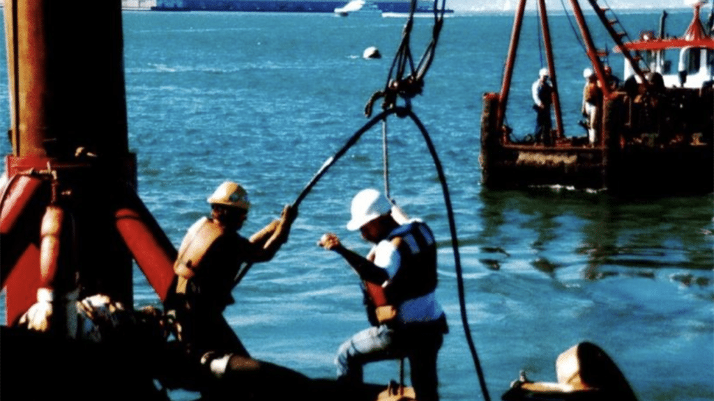 Divers were waiting at the bottom of the bay to direct the segments into exact position. When they surfaced, the divers climbed into two decompression chambers on the barge. It wasn’t 20,000 leagues under the sea, but it was still pretty darn deep.