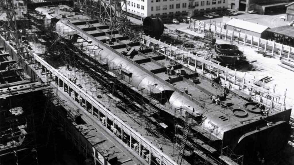 The Tube is made up of 57 sections, each averaging 330 feet in length. The segments were fabricated at Bethlehem Shipyards in South San Francisco, from which they were launched, towed into the bay, and then sunk into their proper positions.