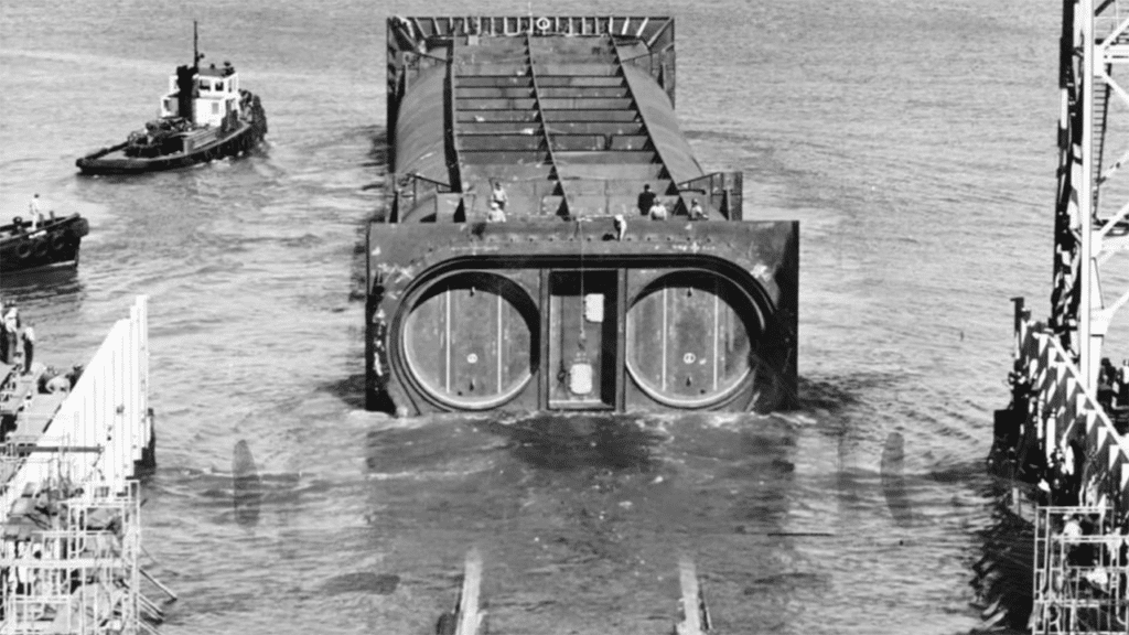 The contract called for a demanding two-and-a-half-year deadline for completion of the basic structure, so the Trans-Bay Constructors developed a fierce schedule at a pace of building and placing two Tube sections a month. There simply wasn’t time to make mistakes.
