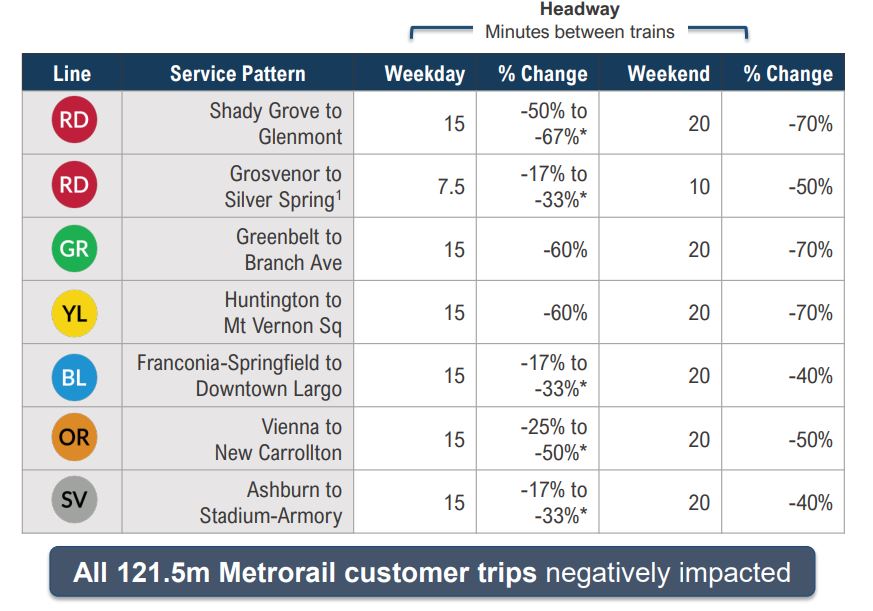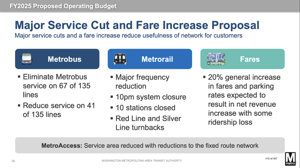 The FY2025 Proposed Budget, according to WMATA, includes “unprecedented” service cuts to Metrorail and Metrobus and an increase of fares across all modes. Metrorail service cuts will include longer headways across the system; Red Line “turnbacks” at Grosvenor-Strathmore and Silver Spring Stations, reducing train frequencies for end-of-line stations; Silver Line “turnbacks” at Stadium-Armory and Silver Line service between Ashburn and Stadium-Armory only, reducing train frequencies to Downtown Largo; closure of 10 stations; a 10 p.m. closing time across the system; and decreased service on all lines, reducing the number of trips with six minutes or better service from 81% in FY2024 to 10% in FY2025. MetroAccess service will be reduced to reflect the legally required service area and hours based on the decreased Metrorail and Metrobus service levels. Additionally, the FY2025 Proposed Budget includes a 20% general increase in fares and parking fees.