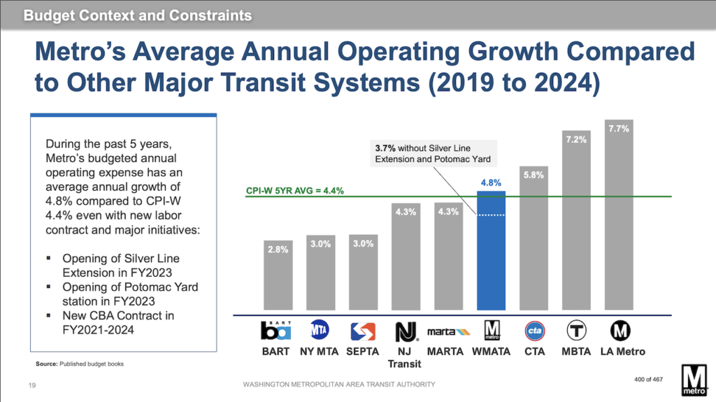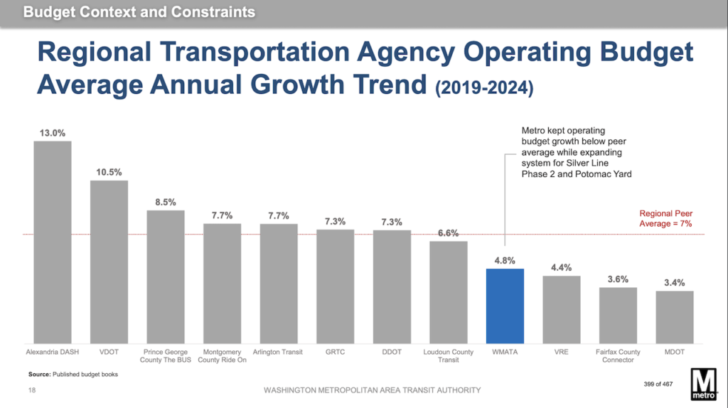 “A financial strategy that indexes our operating and capital funding to inflation would provide Metro with predictability and long-term sustainability so the region can meet its economic and mobility goals,” the agency said. “Of its transit peers nationwide, WMATA alone lacks a dedicated source of operating funding limiting our ability to plan with certainty beyond the current fiscal year.”