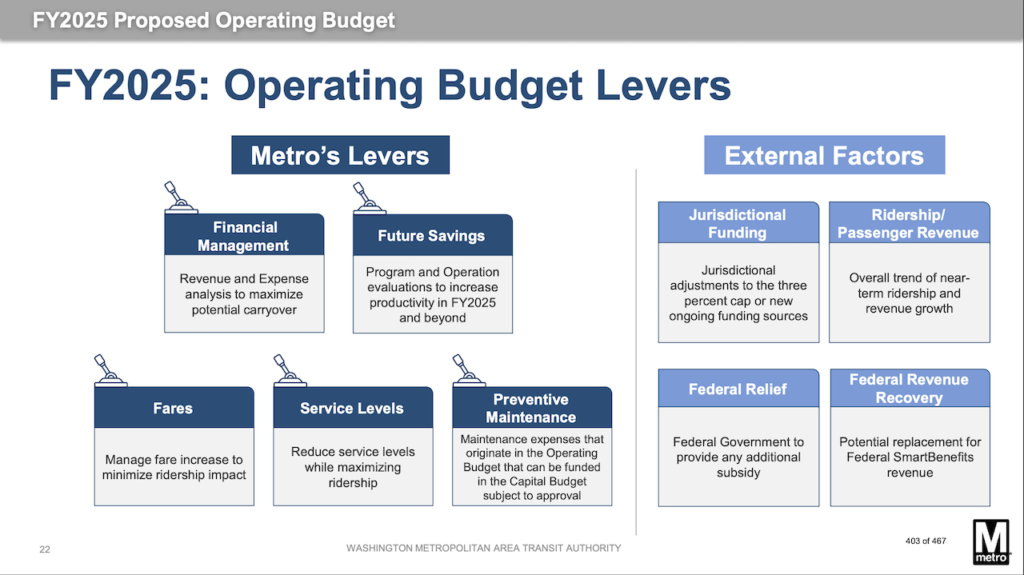 External levers, those outside of the agency’s control, include an increase in jurisdictional subsidies or new funding sources, additional federal relief funding, ridership patterns that increase revenues, and federal transit benefit revenue recovery. Given current legal funding constraints and other measures outside of WMATA’s control, the FY2025 Proposed Budget “uses all internal levers to close the operating deficit.”