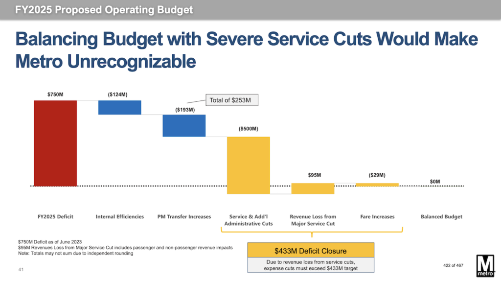 “Closing this deficit through major service cuts and fare increases will make Metro unrecognizable, halting the ridership recovery, reducing or eliminating service across all modes, and necessitate steep reductions in maintenance, police presence, and customer service functions,” the agency said. “Customers will experience severe crowding, longer police response times, and more frequent elevator and escalator outages. These service cuts are below current capacity needs and will likely trigger a death spiral of a loss of ridership, detrimentally impacting the region into the future through worse traffic, reduced access to jobs and opportunities, and more pollution. In addition, these budget cuts will eliminate over 2,200 Metro positions.”