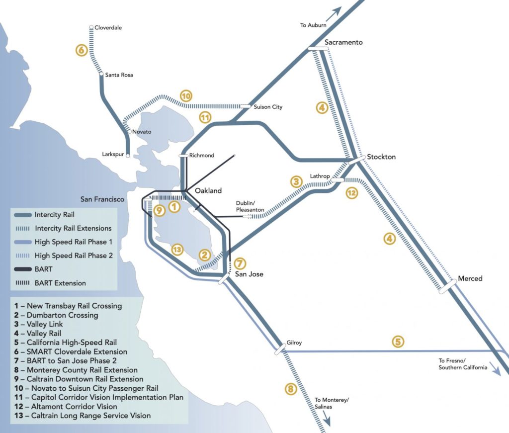 BART has allocated $110 million from its Measure RR bond, approved by voters in 2016, for project planning; the Metropolitan Transportation Commission (MTC) has also earmarked $50 million from Regional Measure 3 for the project; and the California State Transportation Agency (CalSTA) provides approximately $1 million annually, which is administered by Capitol Corridor.