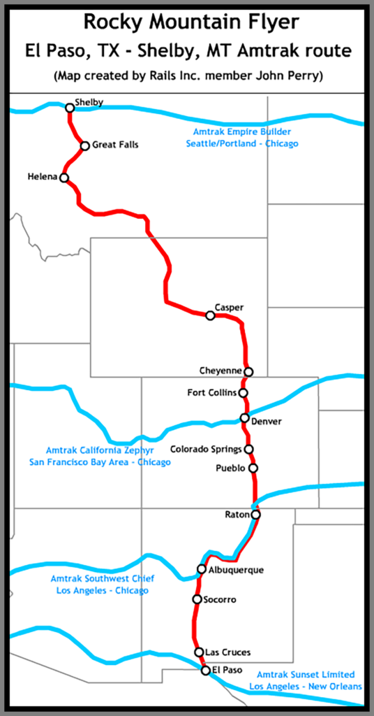 One is J.W. Madison, head of Rails, Inc. in New Mexico. Madison proposes the Rocky Mountain Flyer, a train that would run on a north-south alignment in the middle of the gap between the Texas Eagle route and the West Coast. The proposed train would run from El Paso, Tex. to Shelby, Mont. through Albuquerque, Denver, Cheyenne, Wyoming and north through Montana. It would establish physical connections with all of Amtrak’s current east-west trains in the region, as well as other trains from the past that advocates elsewhere are attempting to restore. Portions of that proposed route are also included in Amtrak’s 2035 plan.