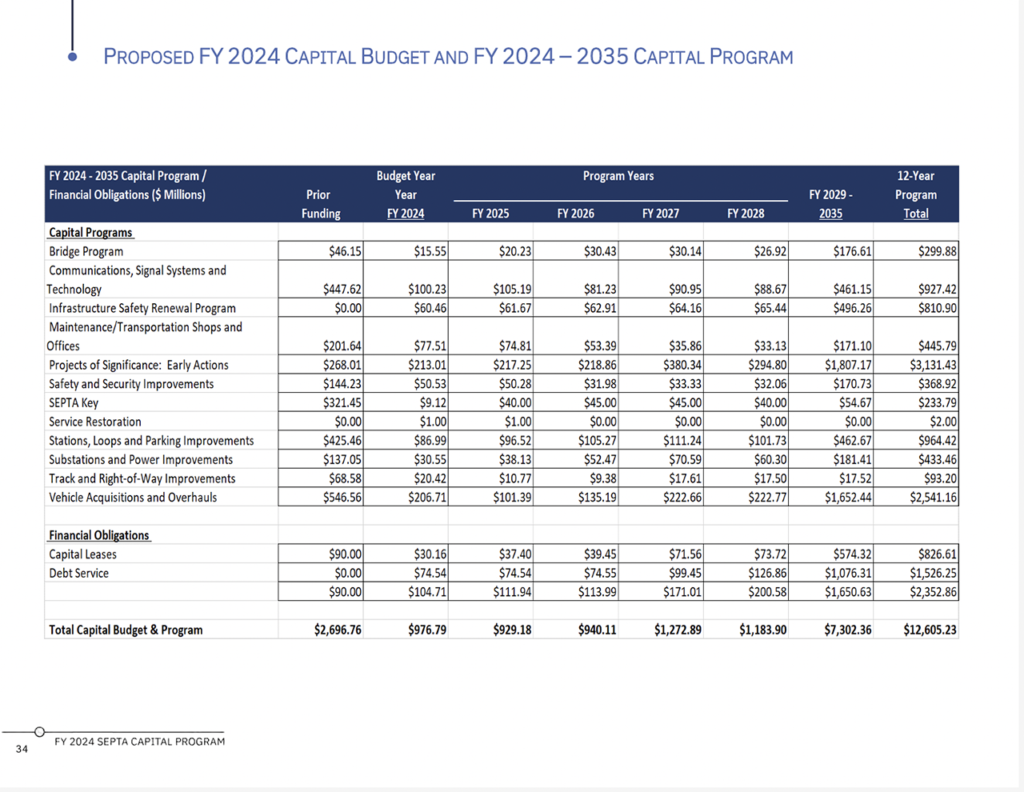 SEPTA reported that its capital budget of $976 million is just shy of last year’s billion-dollar plus plan, while the 12-Year Program represents its “largest-ever investment in the system” at $12.6 billion (download below).