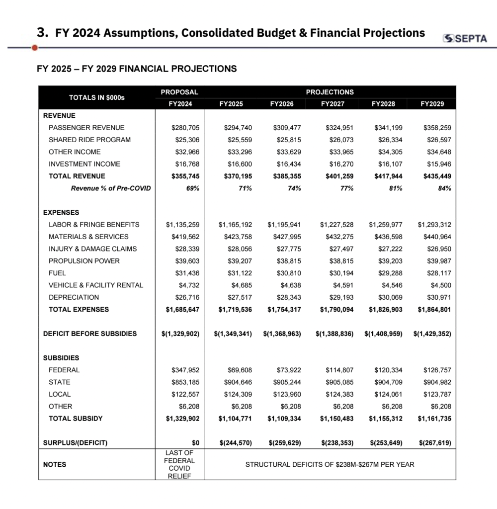 According to SEPTA, the $1.69 billion FY24 operating budget (download below) uses the final installment of federal COVID relief funding “that has helped to avoid service cuts and fare increases associated with pandemic-induced revenue losses.” By April 2024, the federal COVID relief funding is forecast to be exhausted and SEPTA will face recurring structural deficits exceeding $240 million starting in FY 2025, the transit authority said.
