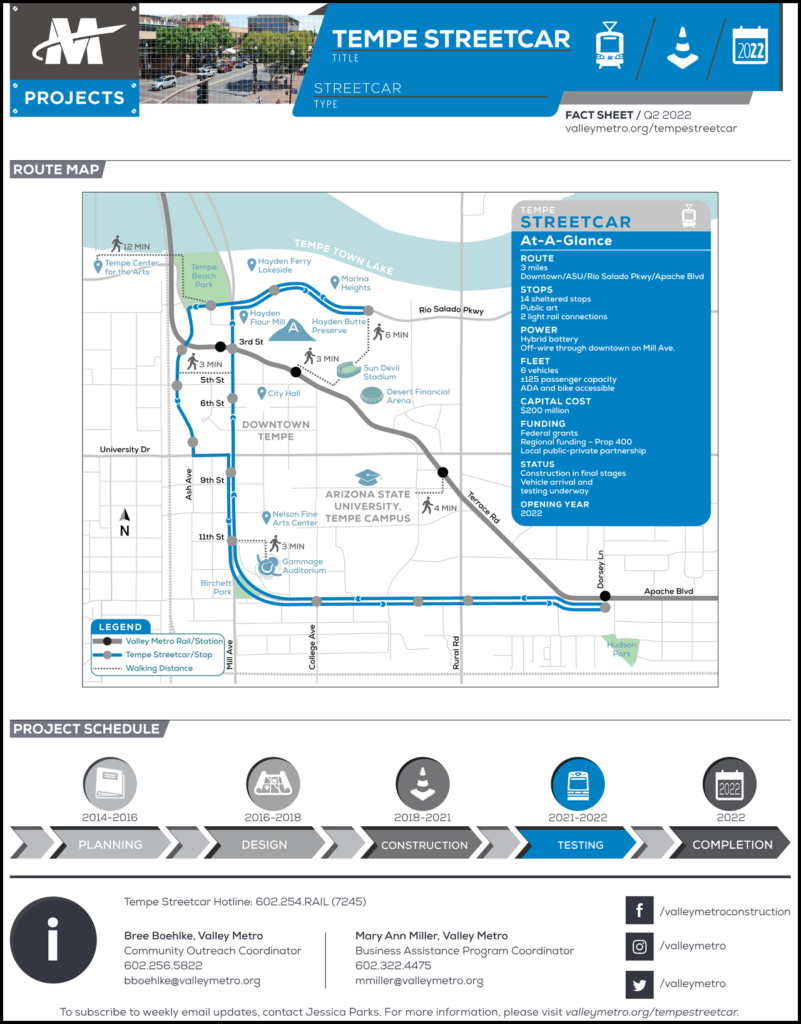 The Federal Transit Administration (FTA) awarded a $75 million Capital Investment Grant to Valley Metro in September 2019 for the approximately $200 million Tempe Streetcar project.