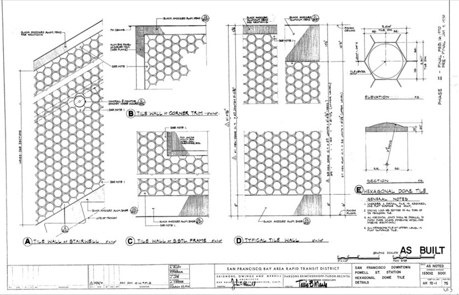 A good place to start is by looking at the original architecture plans for Powell St. and Montgomery St. stations, which were designed by architecture firm Skidmore, Owings & Merrill (SOM). The plans, however, stick to design details and fail to mention the (soon-to-be) famous tiles.