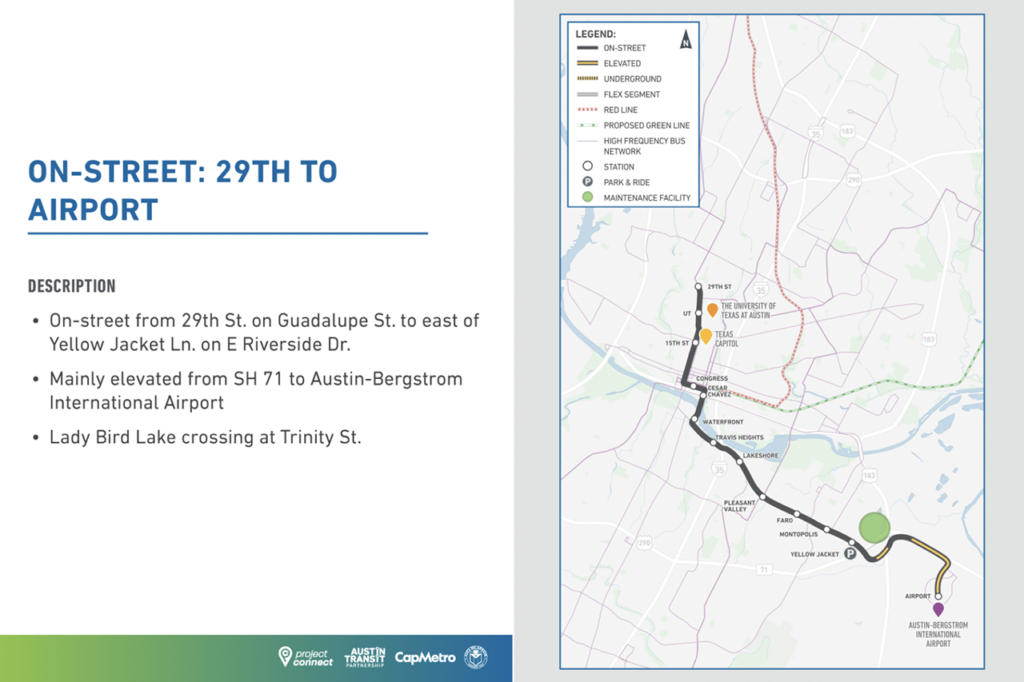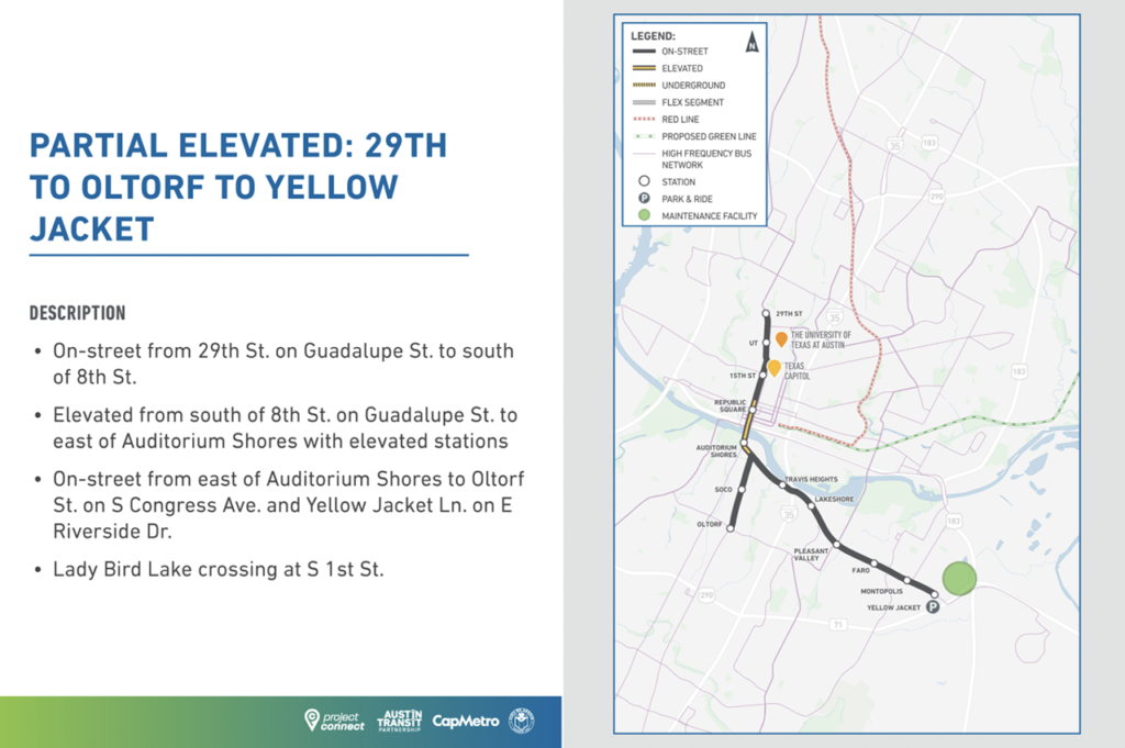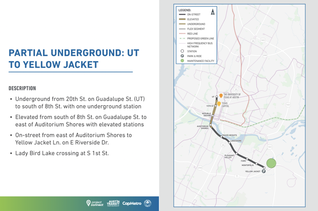 The news outlet reported that the Partial Underground: UT to Yellow Jacket option not only offers elevated rail, but also is the only option with an underground tunnel. However, “instead of a 4-mile system downtown, this tunnel would run about a mile down Guadalupe Street from 20th Street to south of Eighth Street.”