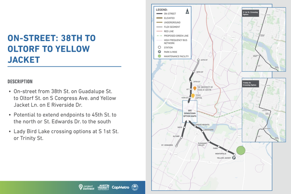 According to NPR, this on-street option “not only includes two downtown configurations, but also asks people if the route should go farther north or farther south.” The route could begin at 38th Street and Guadalupe Street and “go as far south as St. Edwards University,” or it could begin “farther north at 45th Street and end at Oltorf.” NPR reported that a “second line, branching off on the south shore of Lady Bird Lake, would extend down East Riverside Drive to Yellow Jacket Lane. The downtown options are similar to the configurations in the North Lamar to Pleasant Valley plan. The first option would stop at Republic Square, continue across Lady Bird Lake next to the South First Street bridge and stop at Auditorium Shores. The second option would send the line down Third Street, stop at Congress Avenue, and cross Lady Bird Lake at Trinity Street.”