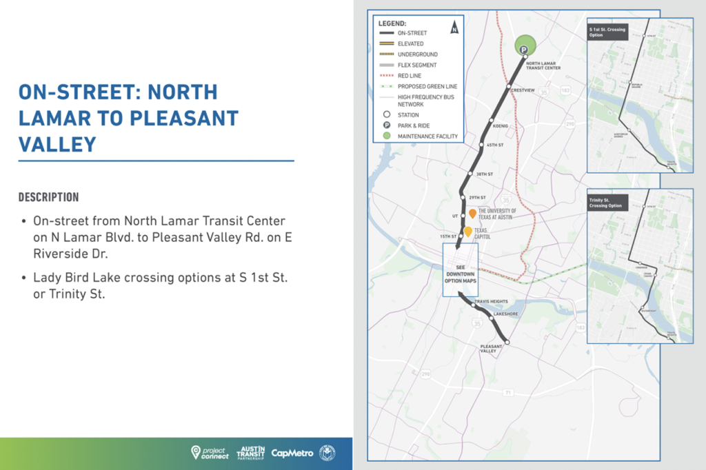 This on-street option includes two choices for downtown. “The first downtown option would have a station at Republic Square Park and cross Lady Bird Lake at South First Street to reach a station at Auditorium Shores,” according to NPR. “The second downtown option would eliminate the Republic Square and Auditorium Shores stations. Instead, the route would turn east down Third Street to reach stations at Congress Avenue and Third and at Cesar Chavez and Trinity Street. The route would cross Lady Bird Lake at Trinity Street and continue to Riverside Drive at Pleasant Valley.”