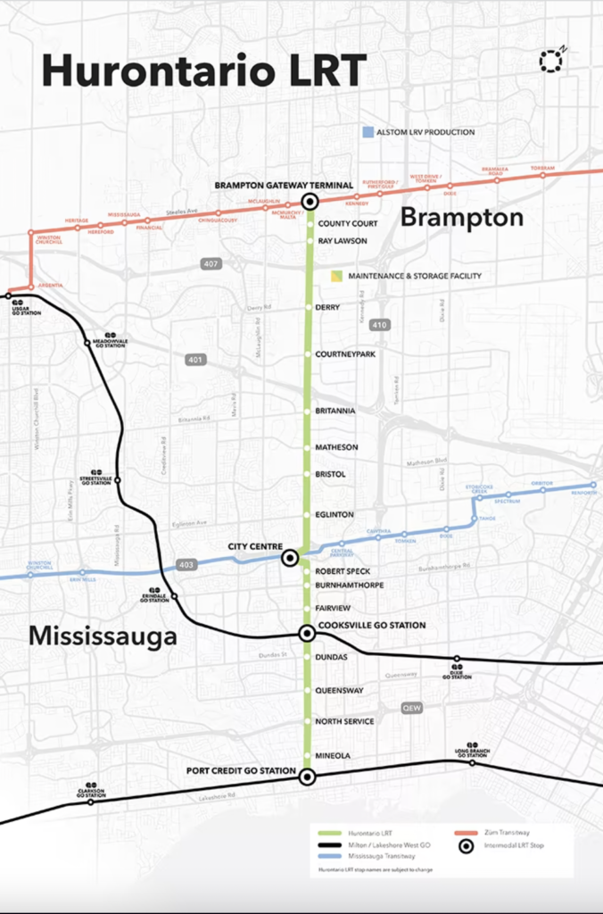 Metrolinx on March 28 provided a progress report on the 11-mile, 19-stop Hazel McCallion Line, which will run between Mississauga and Brampton. The light rail line, named for the former Mississauga mayor, will operate in its own dedicated lane (see map left) and connect with GO Transit (Milton and Lakeshore West lines), the Mississauga Transitway, Brampton Transit, ZUM and MiWay. Major construction began in spring 2020 and is expected to wrap up in fall 2024.