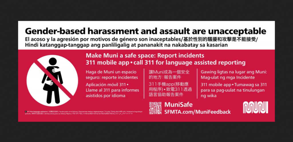 SFMTA’s new MuniSafe campaign aims to increase reporting of gender-based harassment. The agency is calling on Muni (San Francisco Municipal Railway) riders to help make Muni safe by reporting any incident (experienced or witnessed) using the Muni Feedback form or the 311 mobile app or by calling 311. Non-English speakers should call 311 for language-assisted reporting.