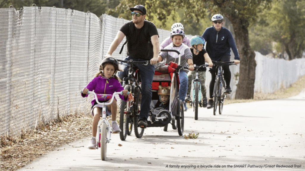 The SMART Pathway is the southern portion of the Great Redwood Trail, which provides first- and last-mile connections to SMART commuter rail stations and offers a safe way to travel along the rail corridor, particularly in areas where the SMART Pathway is the shortest path of travel between communities, according to the railroad, whose 45-mile system includes stations in the Sonoma County Airport area, Santa Rosa, Rohnert Park, Cotati, Petaluma, Novato, San Rafael, and Larkspur.