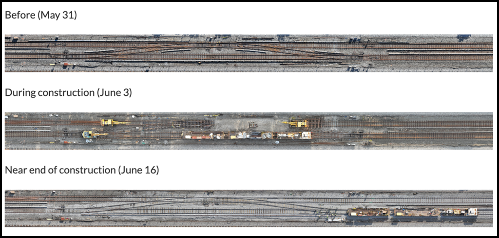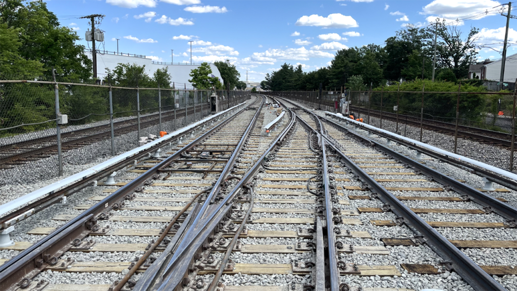 WMATA’s Takoma Metrorail Station bordering the District of Columbia and Maryland on the Red Line will reopen June 28, two days ahead of schedule, according to the transit agency, which started work June 1. Crews rebuilt an interlocking between Fort Totten and Takoma (see photograph above). “The switch area had long-standing drainage issues, so the team removed the existing track, fixed the problem, rebuilt the track bed, and replaced the ballast and ties,” WMATA reported.