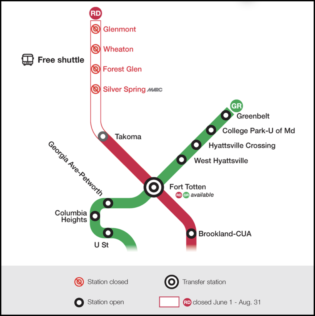 The Red Line from Glenmont to Takoma (see map above) will remain under construction through Aug. 31 due to the Maryland Transit Administration building the Purple Line light rail connection to the Red Line at Silver Spring and other Metro track work, WMATA said. Shuttle buses replace train service; shuttles will still serve Takoma for riders who need to access the station from the north.